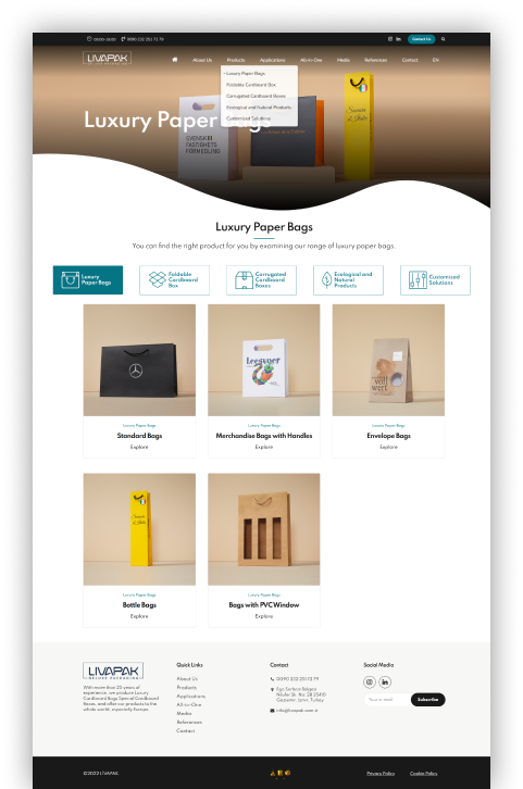 Livapak için hazırladığımız web sitesi, markanın ambalaj ve paketleme çözümlerini modern ve kullanıcı dostu bir yapıda sunmak üzere tasarlandı. Sektördeki yaratıcı ve kaliteli ambalaj taleplerini karşılayan Livapak, dijital platformunda sunduğu detaylı içeriklerle müşterilerine kapsamlı bir bilgi sağlıyor. Kullanıcıların Livapak’ın sunduğu çözümleri kolayca inceleyebileceği bir yapı ile, markanın güçlü yönlerini öne çıkardık.