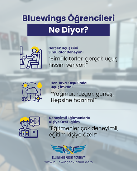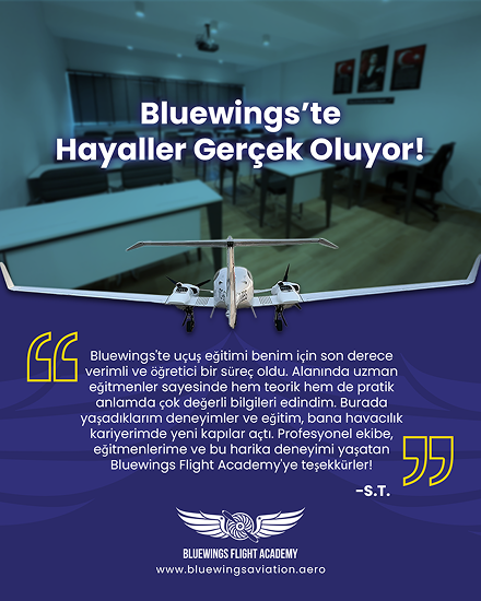 Bluewings, Türkiye merkezli, uluslararası standartlarda pilot eğitimi veren bir uçuş akademisidir. Modern filosu ve uzman eğitmen kadrosuyla adaylarını global havacılık sektörüne hazırlar. Hem teorik hem de pratik eğitimi bir arada sunarak, geleceğin pilotlarını güvenli ve güçlü bir şekilde yetiştirir.