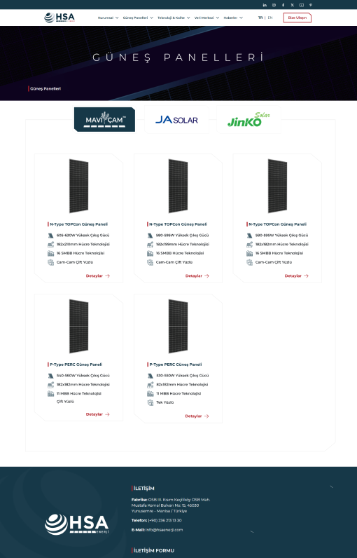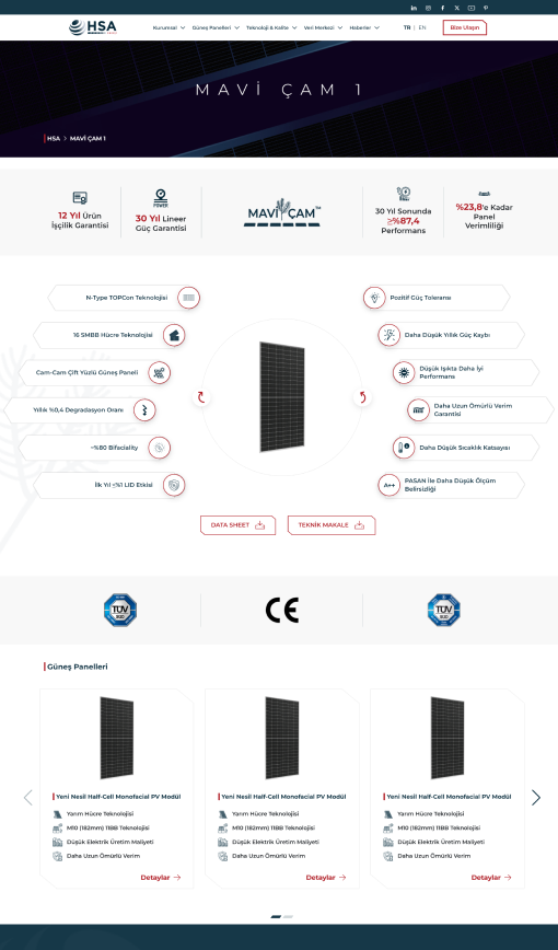 HSA Enerji’nin teknolojik üstünlüğünü yansıtan bu web sitesi, N-Type TOPCon hücre teknolojisi ve 30 yıl lineer güç garantisi gibi inovasyonları vurguluyor. Yüksek performans ve düşük ışıkta dahi etkin sonuçlar sağlayan bu çözümler, web sitesinde sade ve etkileyici bir şekilde sunuldu.
